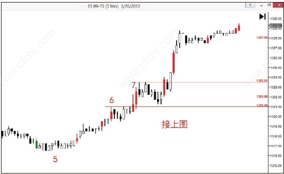 震仓之后价格突破了小溪(4号位置),突破过程中,强劲的需求吸收了小溪中的卖单。这种跳跃小溪的行为给我们的进场搭好了平台。接下来就是耐心等待价格缩量回落在这个平台上,因为缩量代表着供应枯竭,在需求占上风的背景下,供应枯竭意味着价格已经准备好上涨。价格涨到5之后回落,又形成了新的小溪线(5的位置)。