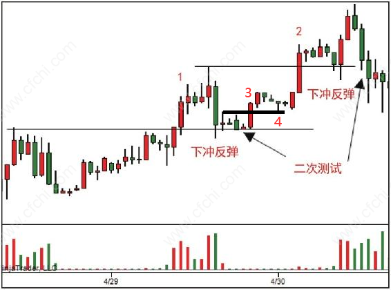 图中蜡烛1之后的第一次测试成交量扩大,我们不能进场,因为市场出现了大量供应。这个供应是否能持续并把价格打压下来,我们还不知道,所以要耐心等待,看这个供应是否耗尽(供应是暂时的,没有跟随)。接下来我们看下冲反弹(弹簧效应)出现了二次测试,这个测试过程中供应已经耗尽,因为它的成交量已经很小,这是我们要等的进场点。