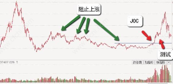 这种枯燥的行情持续到2014年。CM看到公众没有出现恐慌抛售,便采取拖的策略。其中几次很不错的上涨,都被CM阻止住,然后市场又进入非常枯燥的自然下滑行情。他们这种策略使用了很多次,分别在2009年、2010年下半年、2011年上半年。从2011顶部开始,价格进入更加枯燥的阶段。这就是CM的策略,他们利用近5年的股市低迷迫使很多被套的散户割肉。这个过程中我们没有看到终极震仓。但是在2014年末出现JOC(或SOS)。JOC也是测试市场的一个工具,表明需求战胜供应并完全控制市场。JOC之后价格进入2015上半年的牛市。后面出现的缩量回调证明了SOS,这里是安全的进场点(或加仓点)。