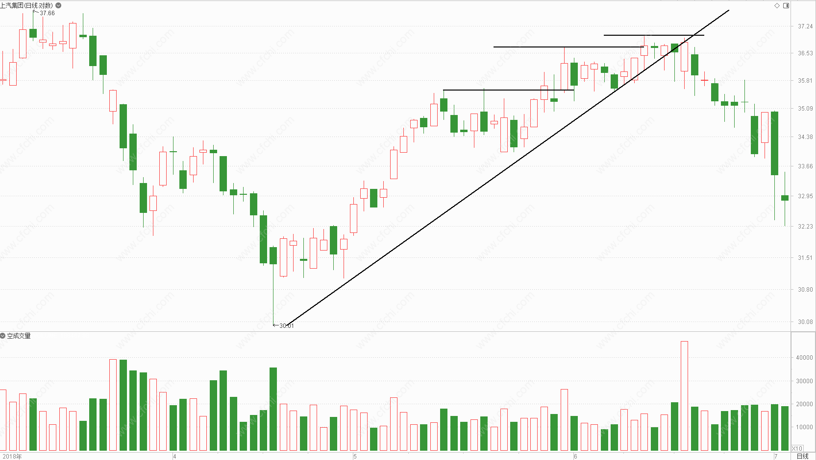如果上涨波的突破幅度递减,表明需求开始减弱或者来自供应的压力增大。突破幅度是两个上升波顶点的距离,但是有时我们看到趋势中很多小的上升波,那些属于次趋势,我们使用主趋势的上升波判断上涨幅度。突破幅度递减,说明随着价格上升,需求开始匮乏,需求的匮乏会导致供应变得积极,接下来的供求关系可以告诉我们是否派发开始。2018年上半年的上汽集团日线图(图1)描述了上涨趋势中突破幅度递减的行情。
