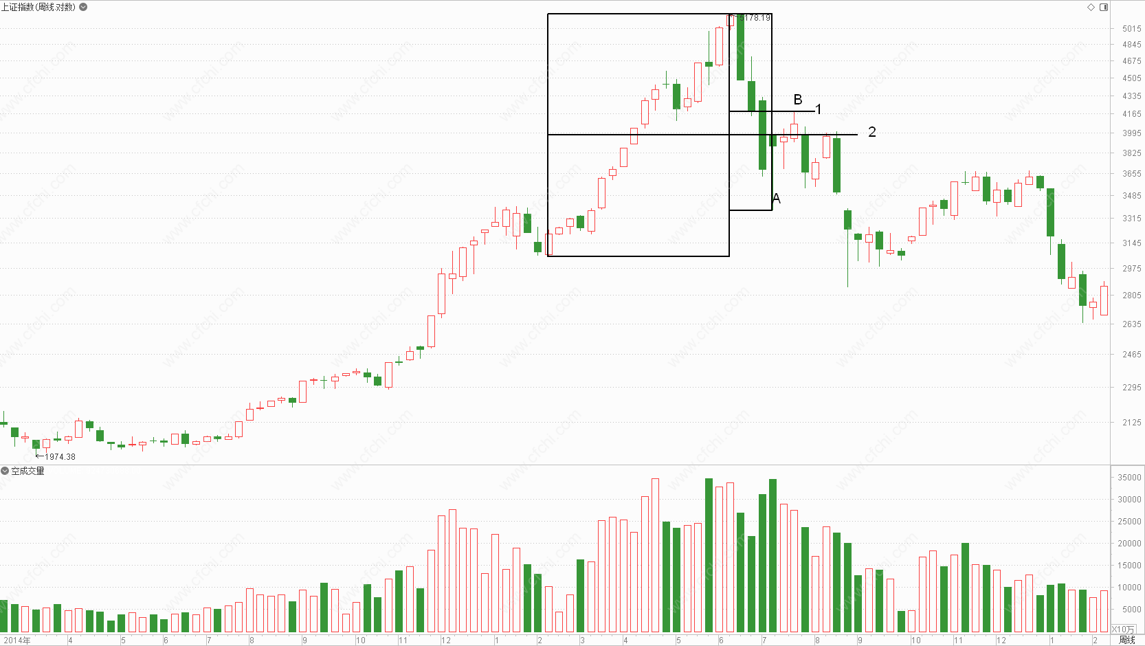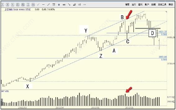 上证指数从2014年后半年的起飞,到2015年6月份结束,然后开始回调到7月初(位置A),这个回调已经严重超过了前面上涨波的50%(横线2),说明需求在减弱;在这个深度回调中,我们看7月份有短暂上涨(A~B),但是没有改变下跌的趋势,因为这个反弹没有超过前面下跌波的50%(横线1),这再一次确认了牛市的结束,也证实了供应在控制市场。