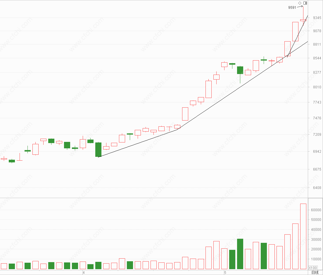 抢购高潮在图上的表现是成交量陡然剧增,同时上涨速度骤然加快,如果用趋势线衡量速度,其上涨角度开始变得很陡(走向垂直,已经严重超过了45度角)。但是我们不能忽视下列信息: