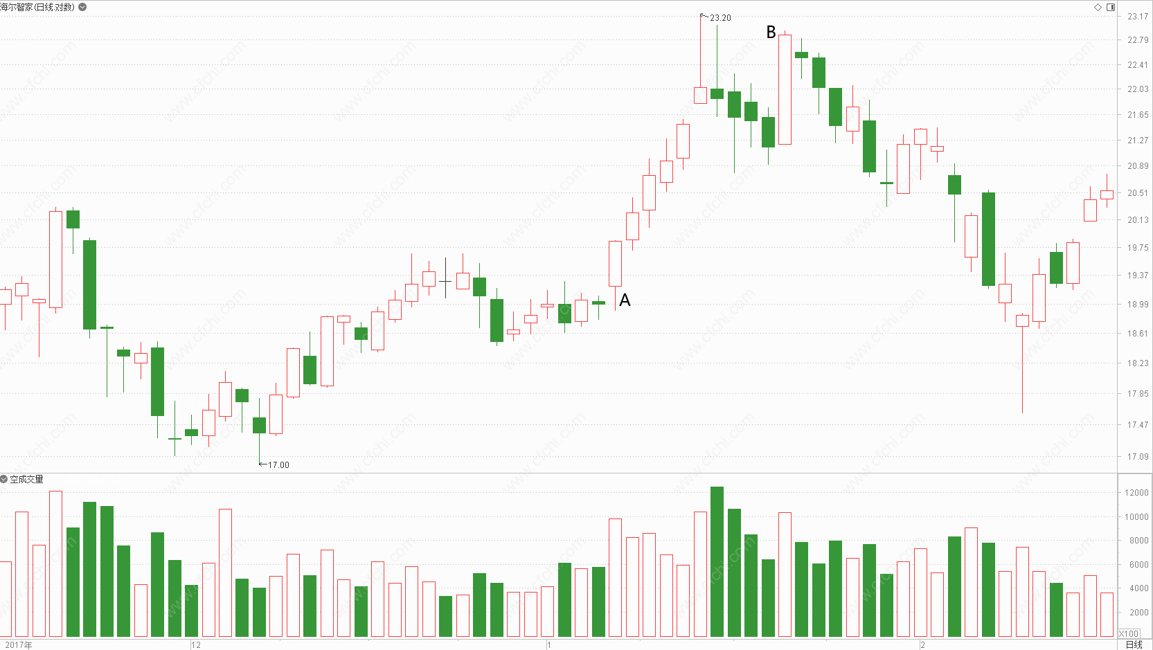 下面我们看图4(青岛海尔日线图,2018年1月份顶部)。