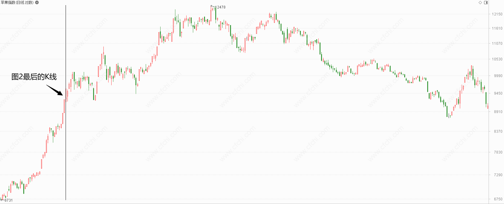 上涨趋势的秩序由两部分组成,一部分是上坡需求持续保持力度,另一部分是回落或停顿的时候供应不足。这个上涨趋势的秩序必须被打破,我们才能考虑趋势的反转。而要做空的话,我们还要看到下跌趋势的秩序形成。从苹果的案例上来看,我们既没有看到上涨趋势的节奏被打破,也没看到下降趋势的秩序形成。所以市场的自身语言还没有告诉我们可以动手做空,单纯凭主观想象和表象形态就决定动手,是只考虑了对自己有利的市场表象信息,而没有客观地分析市场整个背景。苹果期货后市一直涨到了9月末。