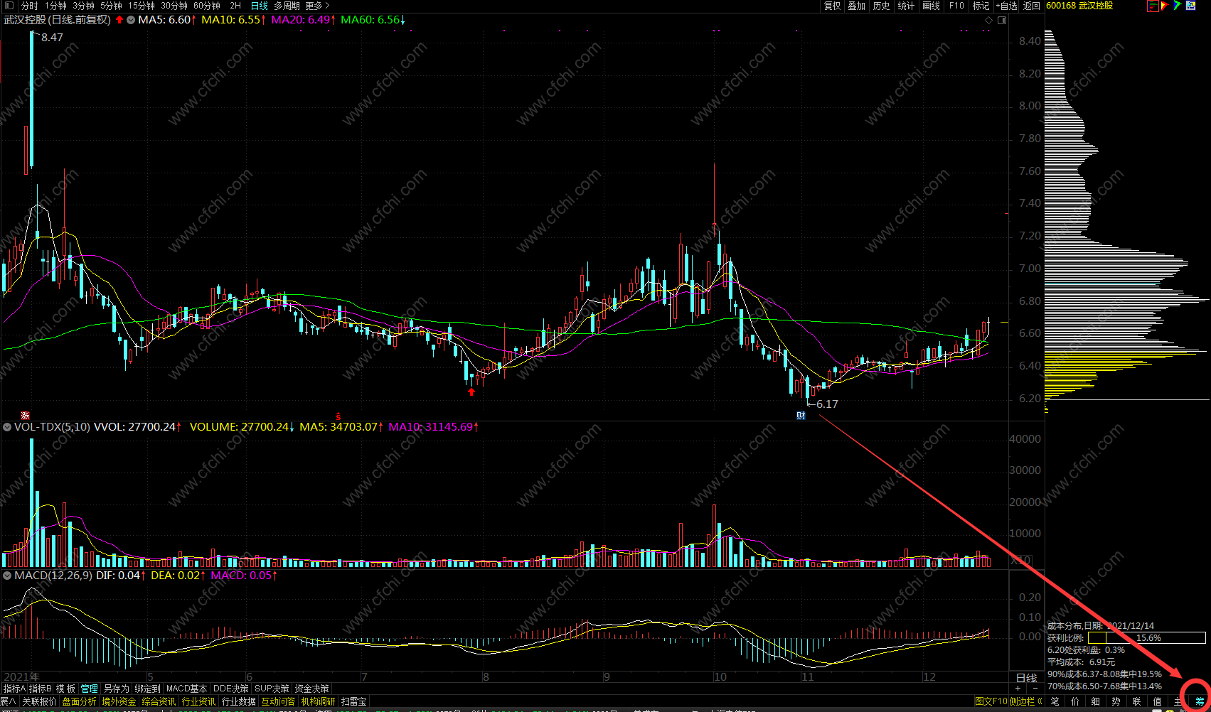 打开通达信,随意选择一只个股,点击右下角的“筹”字即可查看个股的筹码分布图。