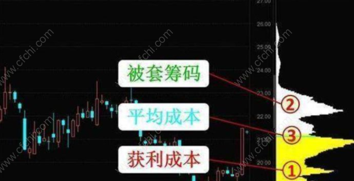 筹码峰有两种颜色:白色和黄色。其中白色代表被套筹码,黄色代表获利筹码,蓝色线代表平均成本。在市场上的一些看盘软件有些是不同的颜色,再此不做说明。如下图: