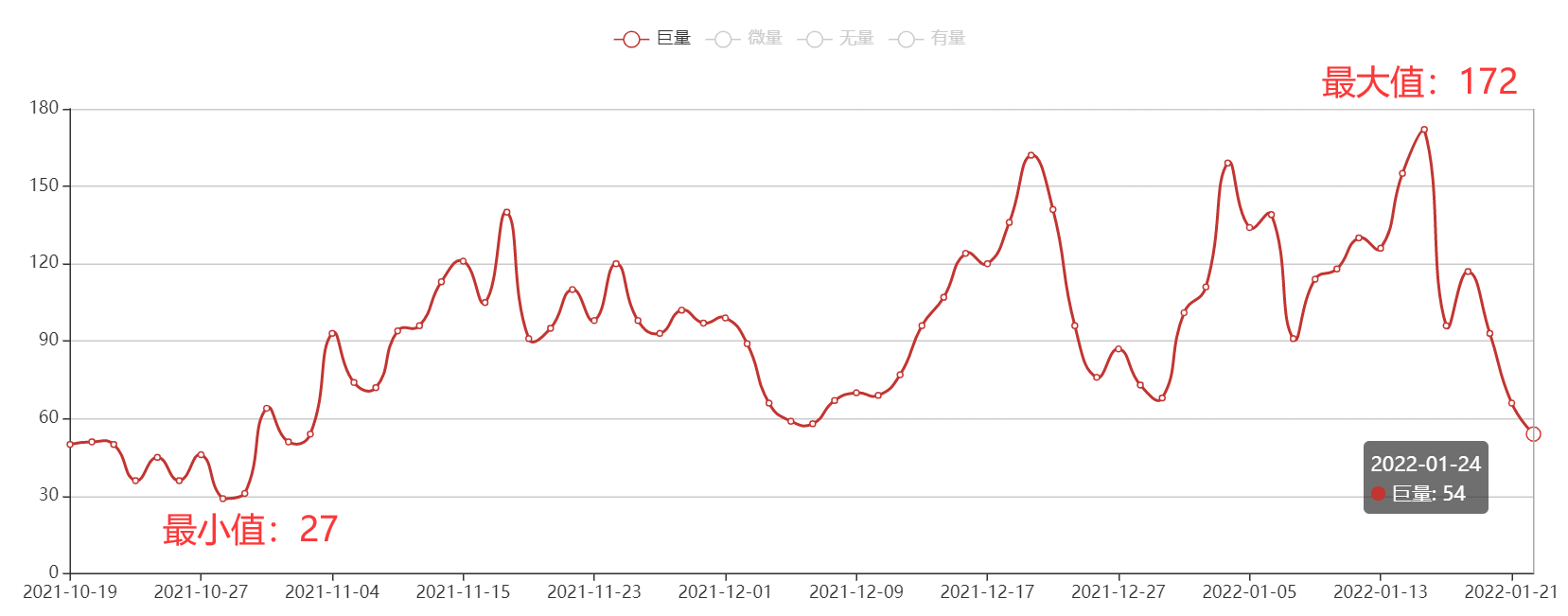 财富池【量能指标】巨量数值为54,较上一个交易日66再度减少,上周五复盘根据数据分析,指数和个股很难短时间反转,需要一些时日去修复,春暖花开之时就是资金进场的时候,即节后以及年报行情的时间点。