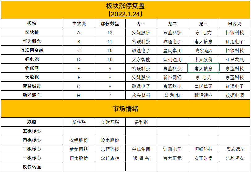 总结:新冠检测、新冠药概念、预制菜概念板块收割退潮区间。九安医疗一字跌停,封单24亿之多。中农联合,开开实业、亚太药业、海辰药业、精华制药、龙津药业、塞力医疗跌停,接最后一棒韭菜想割肉也割不出去了。下面是今日板块涨停复盘数据:
