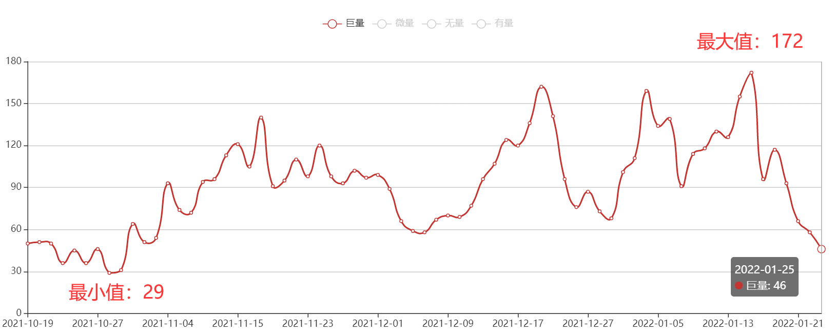 财富池【量能指标】巨量数值为今日收盘后为46,较上一个交易日再度减少12。