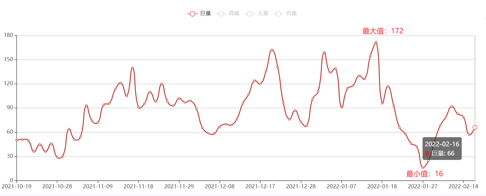 提示:量能指标数值理论上反应主力进攻的个股数量,用于财富池交易系统打板和追涨的重要参考数据源。理论上数值大于100,短线机会较多,小于100,短线机会风险加大。另外可以通过数值曲线变化感知市场的变化过程。