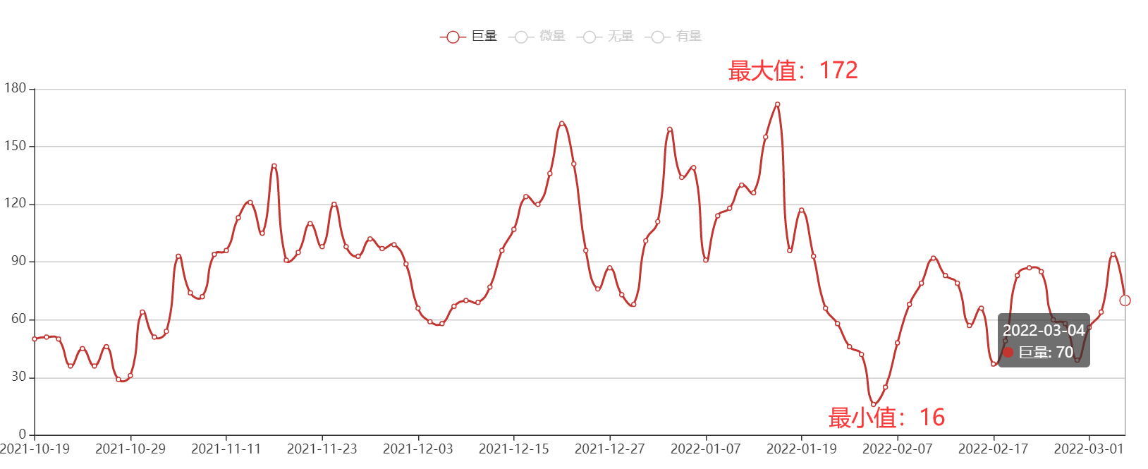 提示:量能指标数值理论上反应主力进攻的个股数量,用于财富池交易系统打板和追涨的重要参考数据源。理论上数值大于100,短线机会较多,小于100,短线机会风险加大。另外可以通过数值曲线变化感知市场的变化过程。