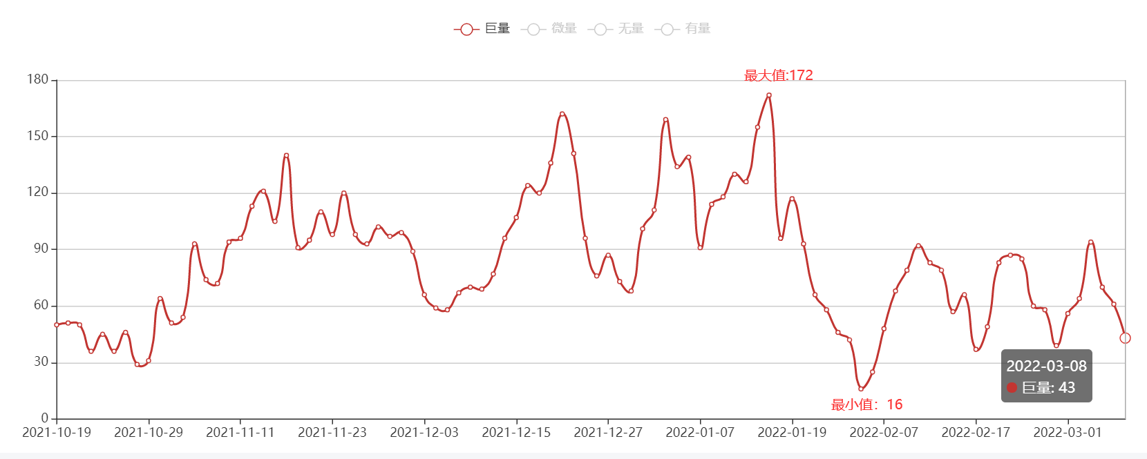 提示:量能指标数值理论上反应主力进攻的个股数量,用于财富池交易系统打板和追涨的重要参考数据源。理论上数值大于100,短线机会较多,小于100,短线机会风险加大。另外可以通过数值曲线变化感知市场的变化过程。