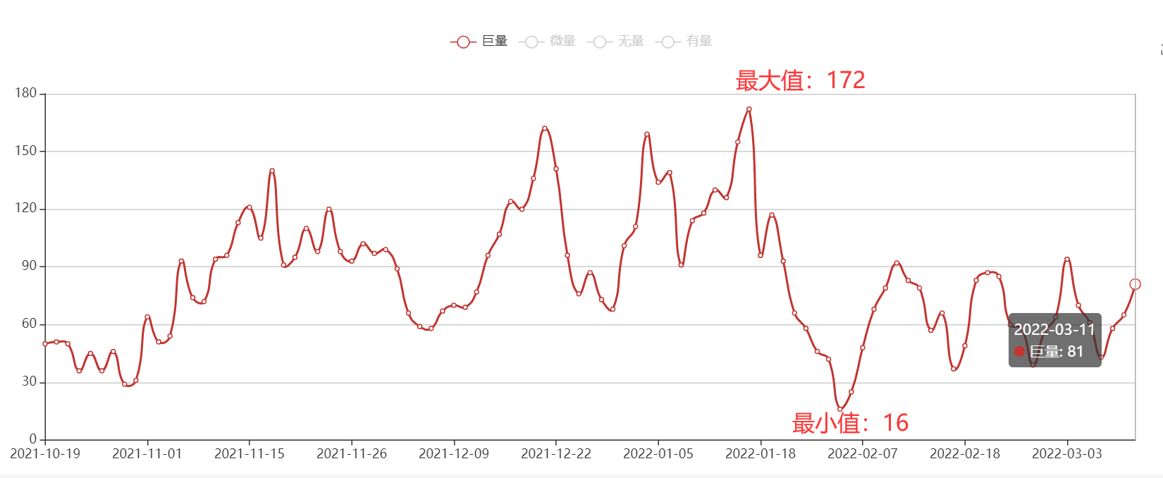 提示:量能指标数值理论上反映主力进攻的个股数量,用于财富池交易系统打板和追涨的重要参考数据源。理论上数值大于100,短线机会较多,小于100,短线机会风险加大。另外可以通过数值曲线变化感知市场的变化过程。