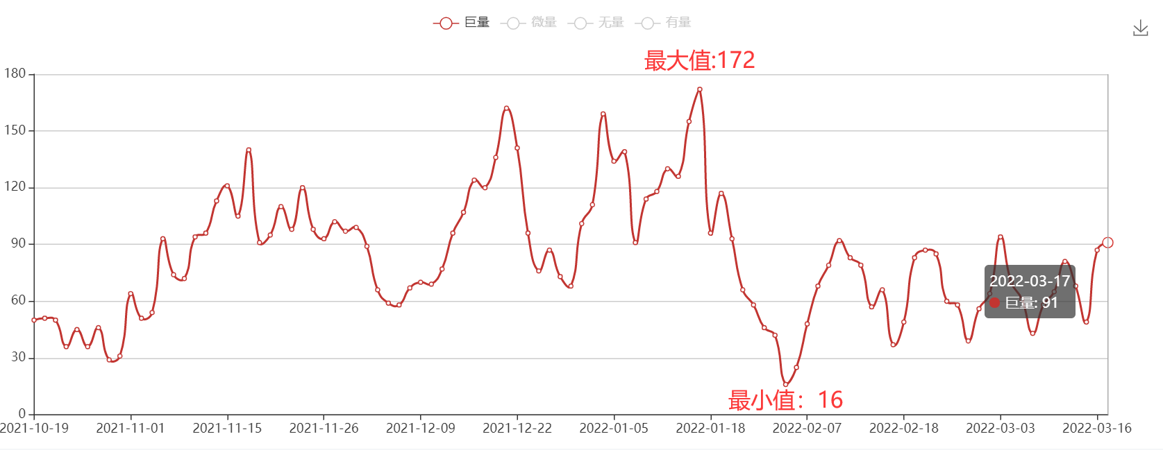 提示:量能指标数值理论上反映主力进攻的个股数量,用于财富池交易系统打板和追涨的重要参考数据源。理论上数值大于100,短线机会较多,小于100,短线机会风险加大。另外可以通过数值曲线变化感知市场的变化过程。