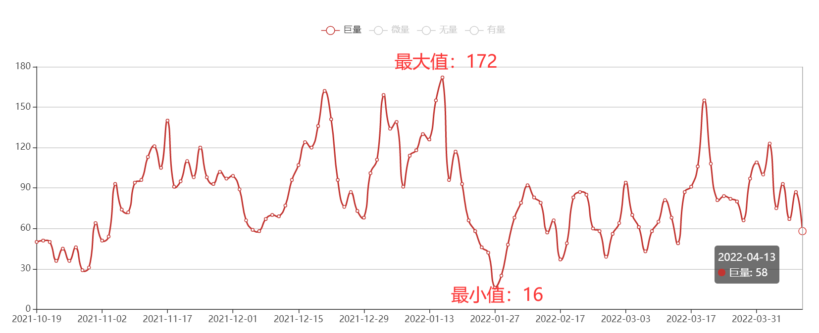 提示:量能指标数值理论上反映主力进攻的个股数量,用于财富池交易系统打板和追涨的重要参考数据源。理论上数值大于100,短线机会较多,小于100,短线机会风险加大。另外可以通过数值曲线变化感知市场的变化过程。