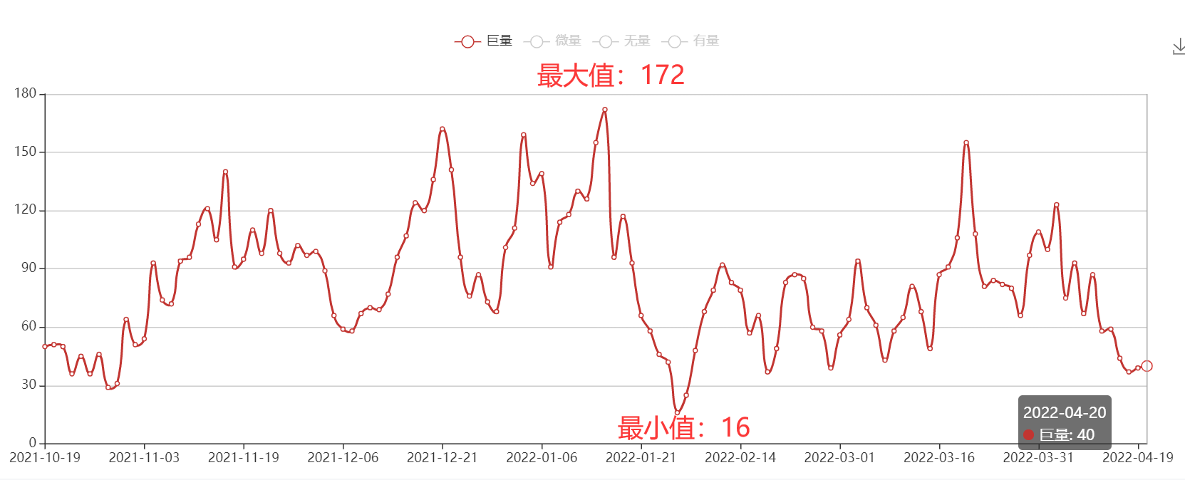 财富池【量能指标】巨量数值40,持续赚钱效应不佳,量能曲线没有很大变动,需要大的利好消息刺激方有可能短期趋势扭转,目前看这个概率极小,人气和赚钱效应相关联,所以暂时不用对人气的恢复做过大期望!