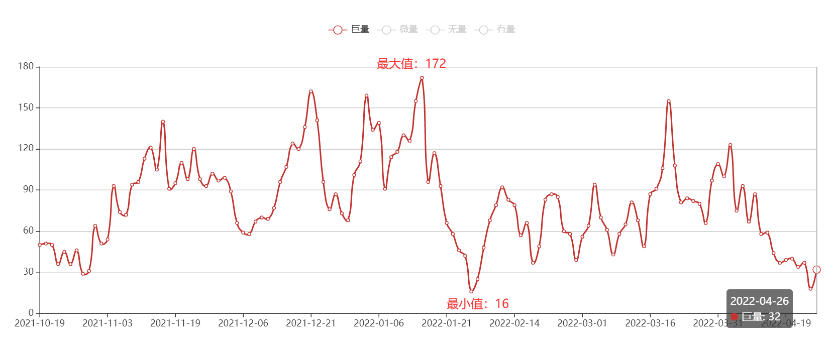 财富池【量能指标】巨量数值32,市场情绪还在悲观状态,观望或小仓巨量人气个股锻炼盘感即可,距离主动进攻时机还需耐心等待巨量数值恢复到100之后。