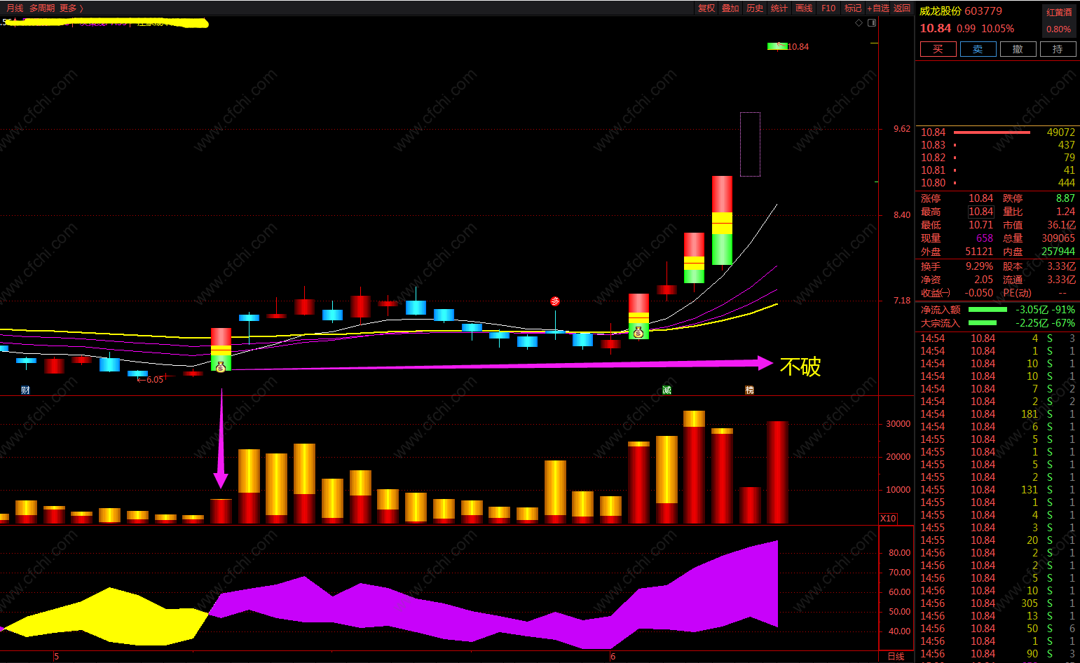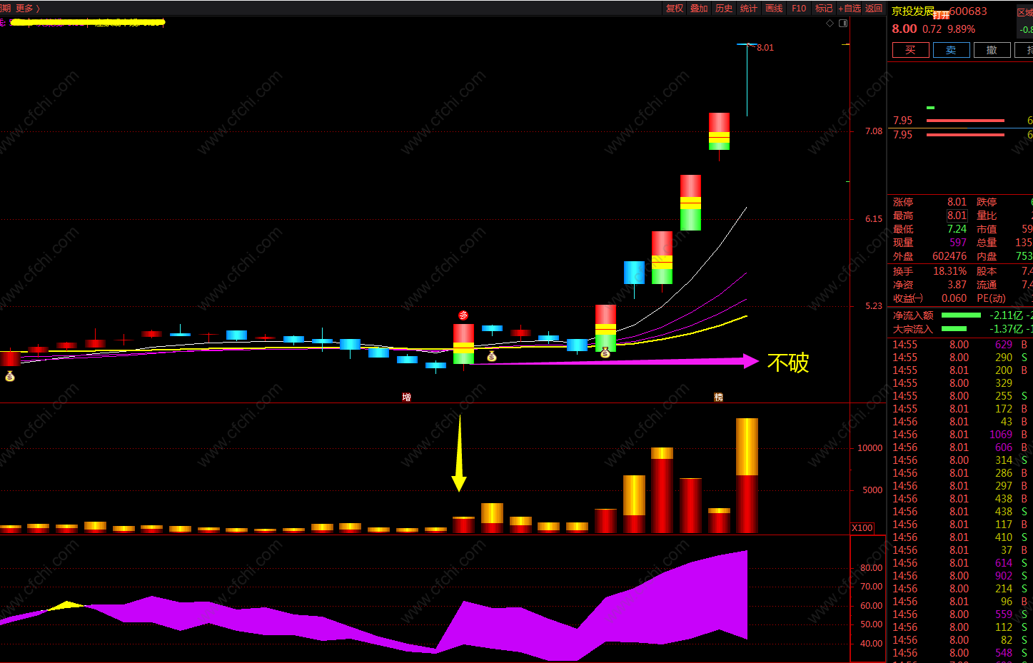 主力拉升前k线异动(回踩的关键k线) 回踩的关键k线,主力拉升中的上车机会。 好端端的上涨走势,突然一根大阴线出现,你会不会心里发毛,难道趋势变了? 在早盘或者上午盘,连涨的股票可能会出现急跌的走势,呈现出的是大阴线砸盘现象,但是底部徘徊一会之后直接拉上去了,形成一根长腿,这一根长腿可不得了,可以踢飞不少人。回踩往往是上涨初期,或者拉升一定幅度之后,回踩一下重要的价格线,有时盘中即时洗盘,有时在重要的k线处荡几天,也是回踩的效果。而这个关键的K线大多是倍量大阳或者是资金柱满柱(代表这主力资金)的4个价格位,而我们就在这个满柱资金对应的K线的4个价位画横线,一般主力的洗盘结束点就在这个些价格带附近,而且大多数情况是不会跌破这个价格的