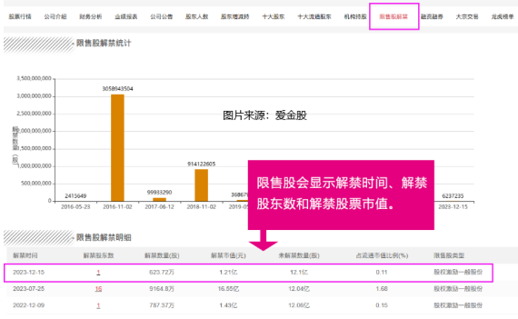 进入个股详情页中的【限售股解禁】菜单也能从中获取个股减持的可能性,提前做好预警,如下图所示。