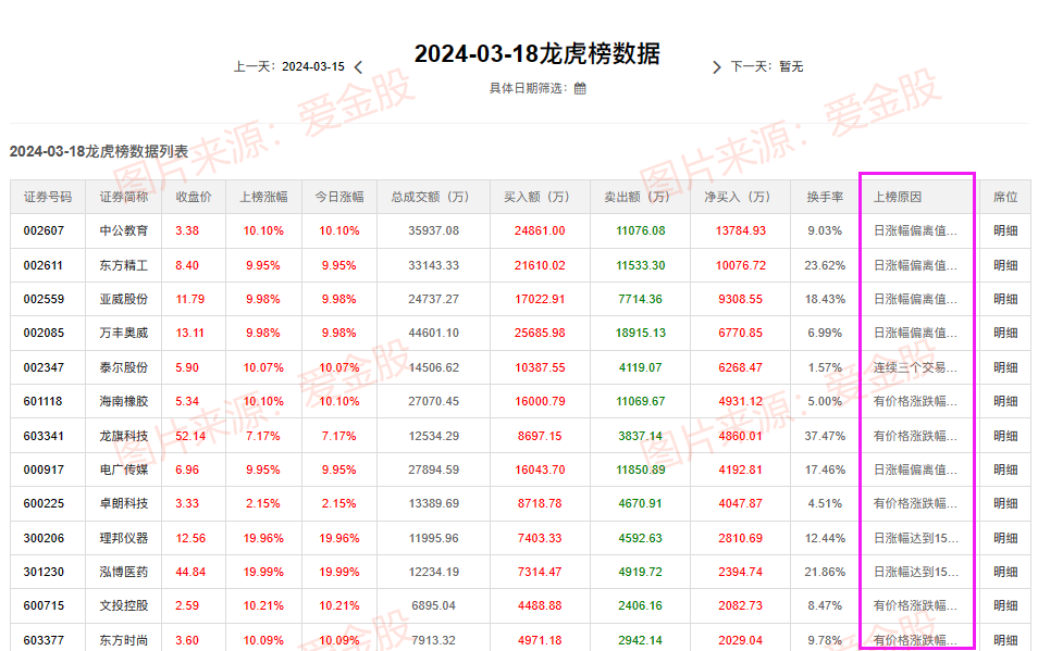 (1)龙榜: 显示了当日买入金额最大的股票,即被称为“龙”的股票,通常表示市场看好的股票。
