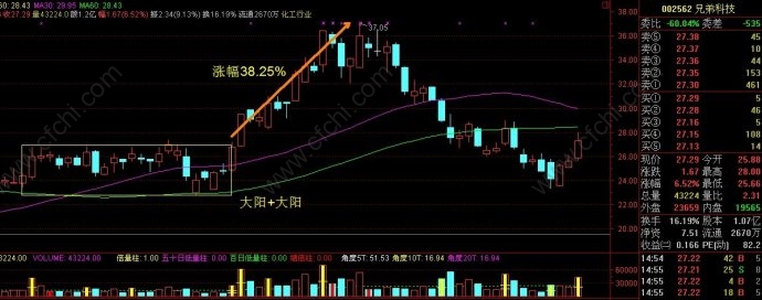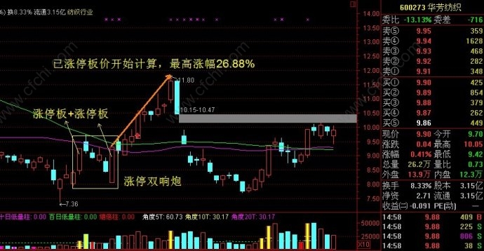由于双响炮本身就是双阳定乾坤的看涨组合,其往往是波段大幅上涨的开始,这点非常重要,大家一定要注意观察和分析。
