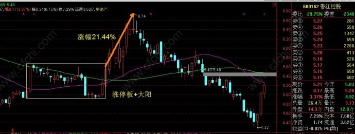 2、前炮涨停板后炮大阳线,或者前炮大阳线后炮涨停板。(大阳线指涨幅大于5%,越大越好,但非涨停的K线,即ST不算)。如下图所示就是前炮涨停板后炮大阳线组合式的双响炮形态: