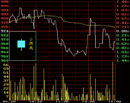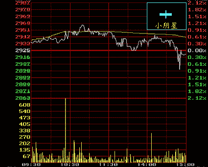 小阴星的分时走势图与小阳星相似,只是收盘价格略低于开盘价格。表明行情疲软,发展方向不明。