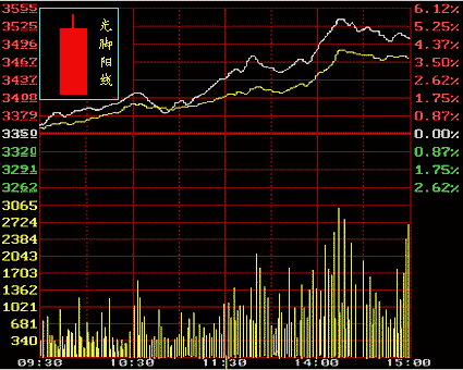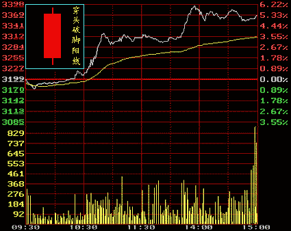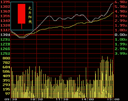 光头阳线若出现在低价位区域,在分时走势图上表现为股价探底后逐浪走高且成交量同时放大,预示为一轮上升行情的开始。如果出现在上升行情途中,表明后市继续看好。