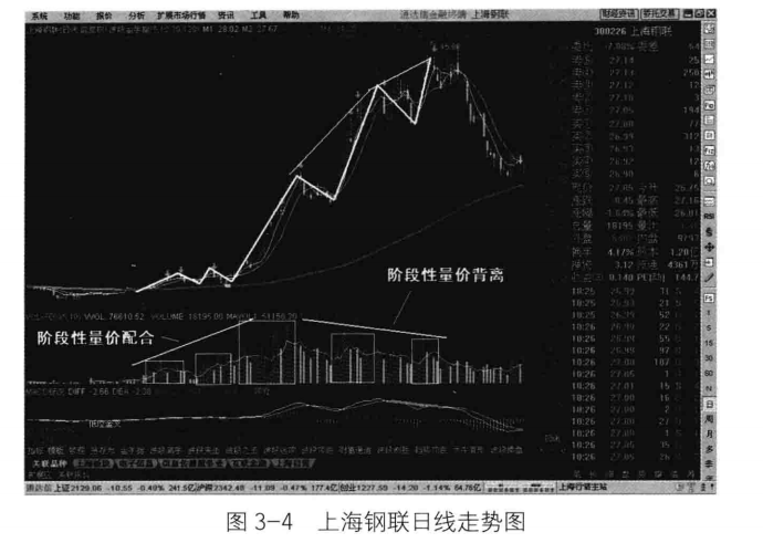 图3-4中,上海钢联( 300226)日线图显示此次的上涨过程量价关系就是由阶段性的量价配合,再到阶段性背离的过程。后面一个上涨浪下的成交量堆比前面一个上涨浪下的成交量堆大就是阶段性量价配合,反之就是阶段性量价背离。