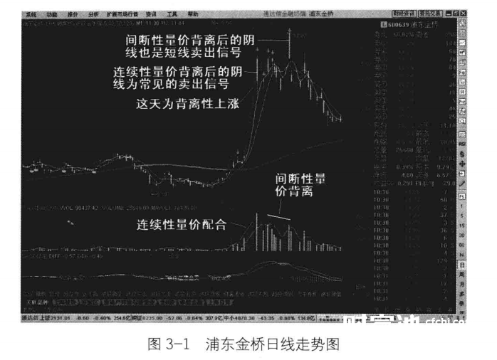 图3-1中,浦东金桥( 600639)日线图显示前期波段上涨先是连续性量价配合,而后出现连续性的量价背离,随后的一根阴线为常规的短线(波段)卖出信号。同样后续所出现的间断性的量价背离后的阴线,也是常见的短线卖出信号。