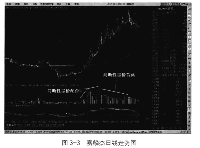 图3-3中,嘉麟杰(002486)日线图显示此次波段上涨的过程也是前期先是间断性的量价配合,而后出现间断性的量价背离,同样此次波段的上涨成交量呈现的也是间断性的缩放特征,这就是所谓的间断性的量价关系。