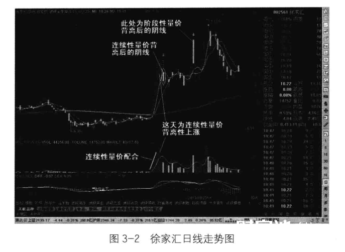 图3-2中,徐家汇( 002561)日线图显示此波段上涨时量价也是先出现配合性上涨,而后背离性上涨,量价关系的变化特征呈现出由配合到背离的特征,前期是连续的上涨,所以体现出来的是连续性量价关系。