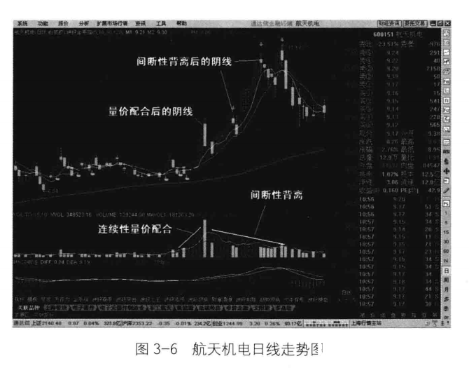 图3-6中,航天机电( 600151)日线图显示前期的上涨就是在股价没有背离的情况下出现放量阴线,后面才出现背离性的上涨,形成了间断性的量价背离。间断性背离以后所出现的阴线,为间断性量价背离阴线,也是常见的卖出信号。