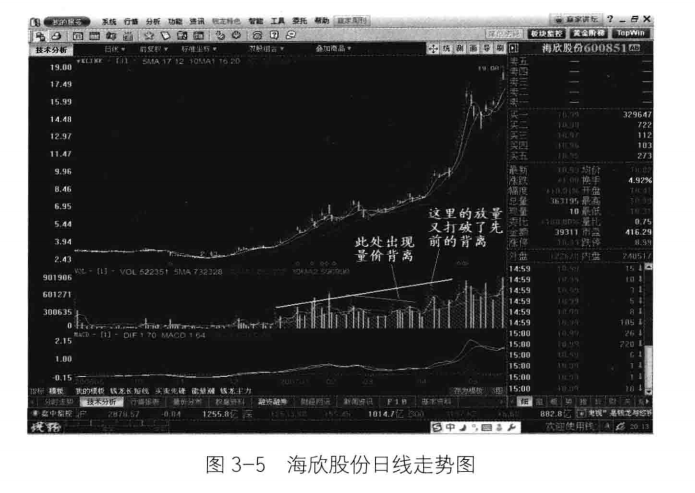 图3-5中,海欣股份( 600851)日线图就显示前期量价关系曾经出现过阶段性的量价背离,但是后续又放量上涨,并且成交量也比前期的大,从而打破了原来的背离,又呈现出量价配合的状态。