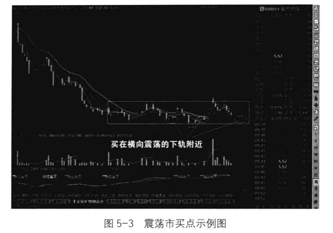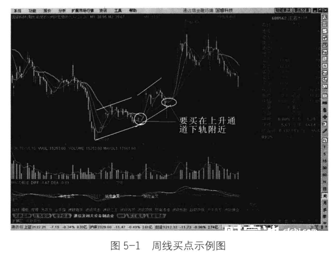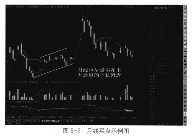 波段买点从安全角度来说要买在周线(见图5-1)或月线(见图5-2 )的上升通道的下轨附近,或是周月线横向震荡(见图5-3)的箱体的箱底价位附近(最好是实体低点比前面实体低点高的股票),这也是波段买点最重要的看点。