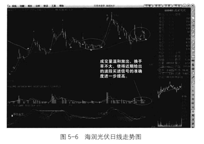 图5-6中,海润光伏( 600401)今日温和放量上涨,换手率2.60%,也不大,后续还会有潜在的量能放出,也使得目前买进信号的准确度有所提高,后续可以积极波段参与。