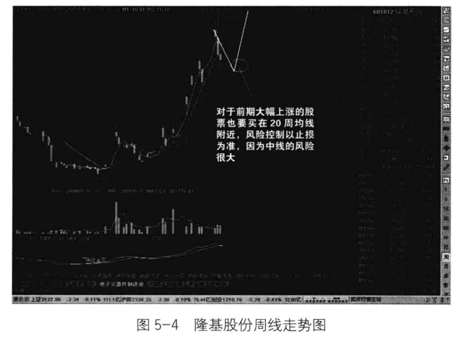 对于上涨中后期的股票,也应该买在20周均线附近日线止跌的时候,要以止损的方式来控制风险。图5-4中,隆基股份( 601012)前期经过大幅的上涨后,处于上涨阶段的后期,位置比较高,这个时候如果想操作的话也要买在20周均线附近止跌的时候,风险控制以止损为准,因为中线的风险很大。