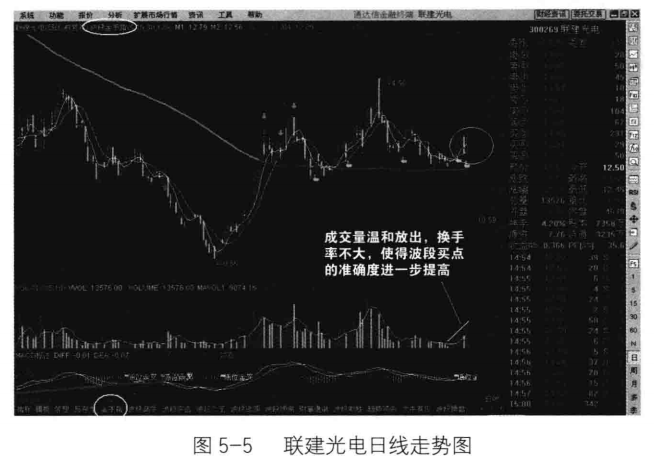 图5-5中,联建光电( 300269)今日温和放量上涨,换手率4.20%,也不大,后续还会有潜在的量能放出,这就使得近期所给出的放量过30日均线的波段买进信号的准确度提高,后续可以积极波段参与。