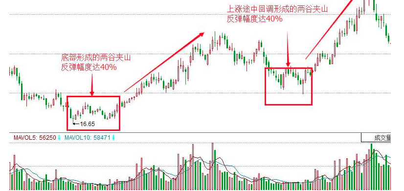 “两谷夹山”是指股市日K线在低位走出类似W底的形态,“两谷”指两个低点非常接近,而两低点中间的K线图如同“A"字形的山峰,因此称之为“两谷夹山”。