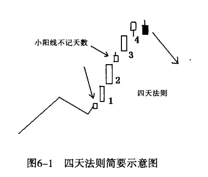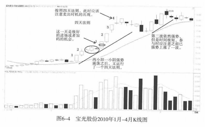 对于绝大多数强势股而言,在小波段上涨中出现中阳线和长阳线的天数为3~5天,也就是平均在4天左右。所以,我们将之称为四天法则。而且这四根长阳线和中阳线是比较连续的,一般仅夹杂着为数不多的几根小阴线和小阳线。