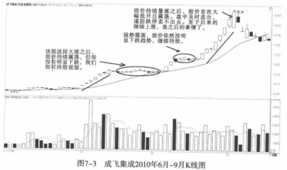 不过,此时离顶部已经不远了,我们已经不需要重新买回。这时,波段运行确实非常充分了,包括时间、上涨幅度以及对应大势的强度等,重新买进的意义不大。有的时候,我们在波段卖出之后,发现股价强势震荡,之后股价又迅速走强,似有再起一波的态势。