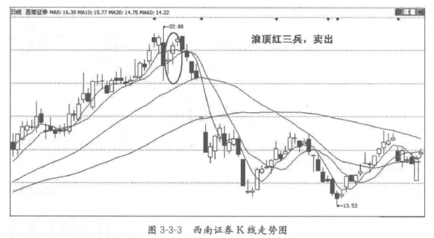 一、西南证券(600369) 如图3-3-3中圆形区域所示,该股在高位区域出现“红三兵”的形态后股价开始大幅度的下跌;因为高位的“红三兵”并不是股价持续上涨的信号。主力创造“红三兵”形态吸引散户资金,从而实现继续出货的目的。