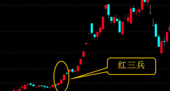 红三兵一般出现在见底回升的初期,升幅不大,动作缓慢,但升势相当稳定。如果红三兵实体过长,短期指标有超买迹象,应引起注意。成交量无太多变化,但在随后的突破飙升时成交量会成倍放大。