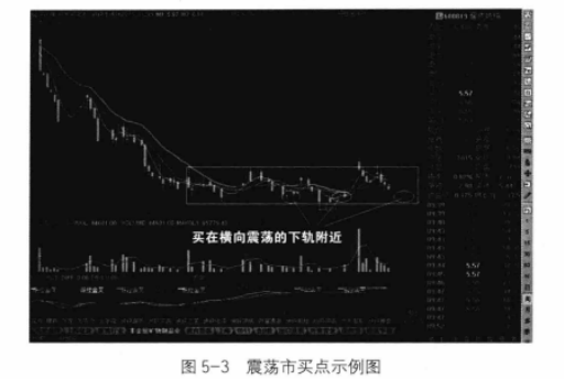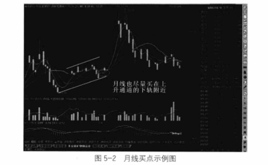 第一,仔细分析周线、月线图所表现出来的个股的中长期态势以及位置。波段买点从安全角度来说要买在周线(见图5-1 )或月线(见图5-2 )的上升通道的下轨附近,或是周月线横向震荡(见图5-3)的箱体的箱底价位附近(最好是实体低点比前面实体低点高的股票),这也是波段买点最重要的看点。