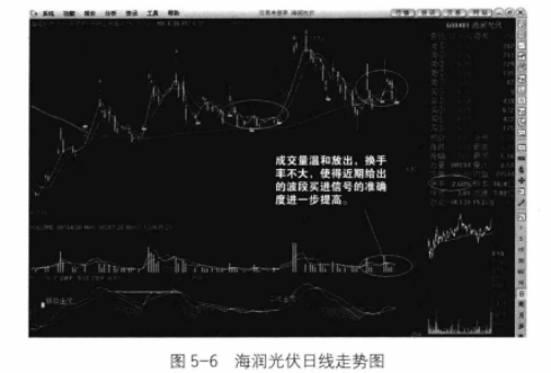 图5-6中,海润光伏( 600401)今日温和放量上涨,换手率2.60%,也不大,后续还会有潜在的量能放出,也使得目前买进信号的准确度有所提高,后续可以积极波段参与。