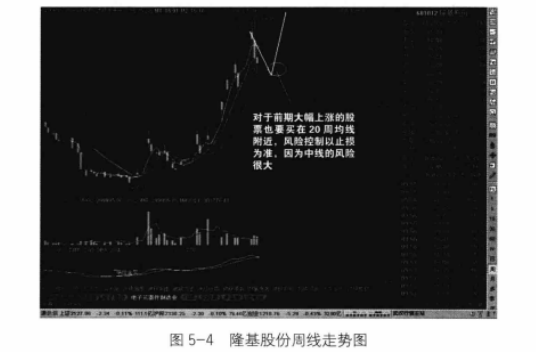 对于上涨中后期的股票,也应该买在20周均线附近日线止跌的时候,要以止损的方式来控制风险。图5-4中,隆基股份( 601012)前期经过大幅的上涨后,处于上涨阶段的后期,位置比较高,这个时候如果想操作的话也要买在20周均线附近止跌的时候,风险控制以止损为准,因为中线的风险很大。