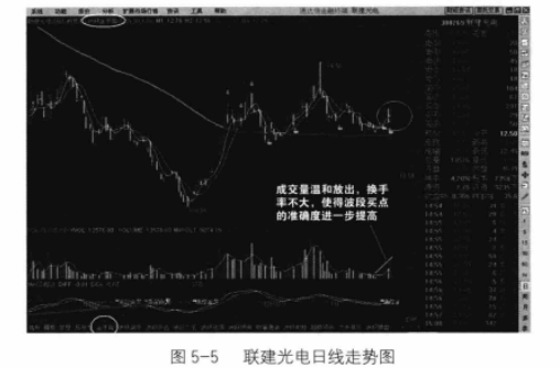 图5-5中,联建光电( 300269)今日温和放量上涨,换手率4.20%,也不大,后续还会有潜在的量能放出,这就使得近期所给出的放量过30日均线的波段买进信号的准确度提高,后续可以积极波段参与。