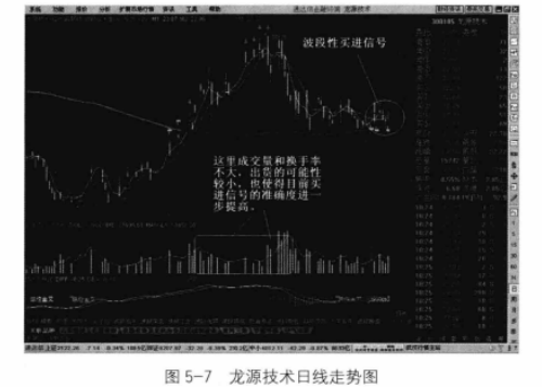 图5-7中,龙源技术( 300105 )前期方框内的成交量和换手率不大,并且没有巨量产生,主力出货的可能性较小,这会使得此次的买点准确度有所提高。