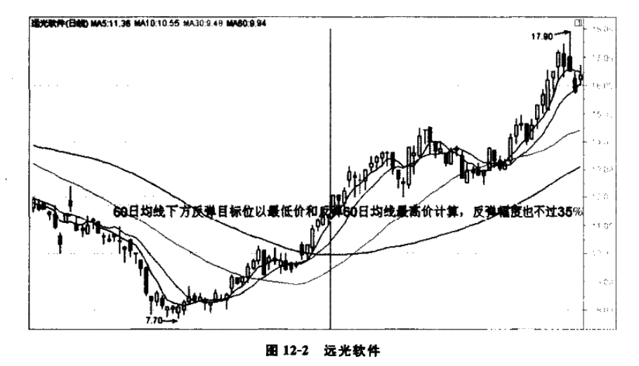 如图12-2所示,60日均线下方反弹的目标位以最低价和反弹60日均线最高价计算,反弹幅度也不过35%。