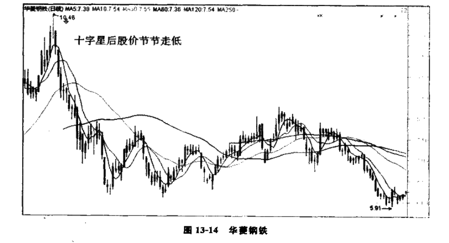 案例5华鳌钢铁(000932)——十字星后,股价节节走低,从10元跌到3元(见图13-14)。